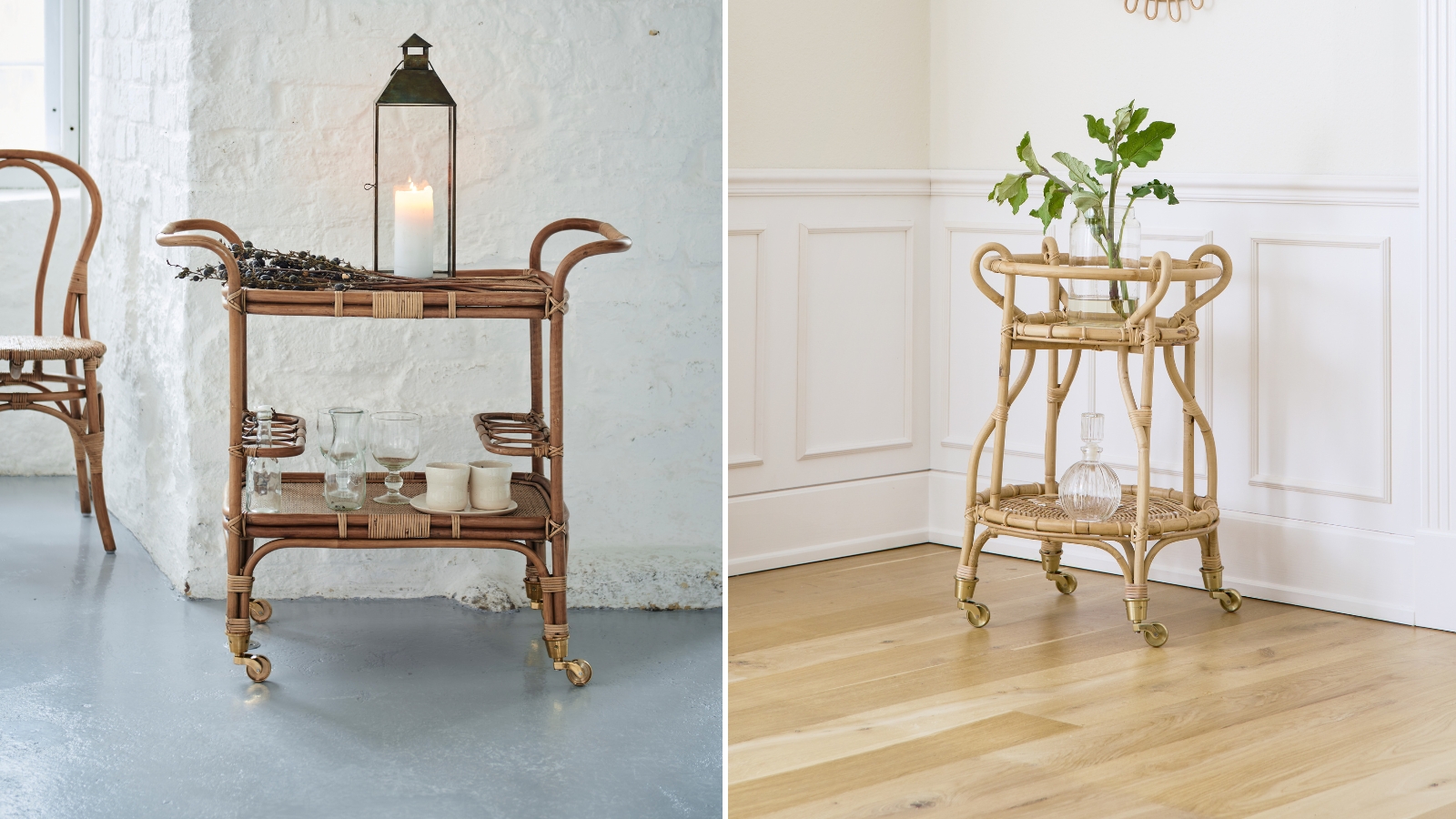 Rattan trolleys that function as mobile bar carts or storage units, combining style and practicality.