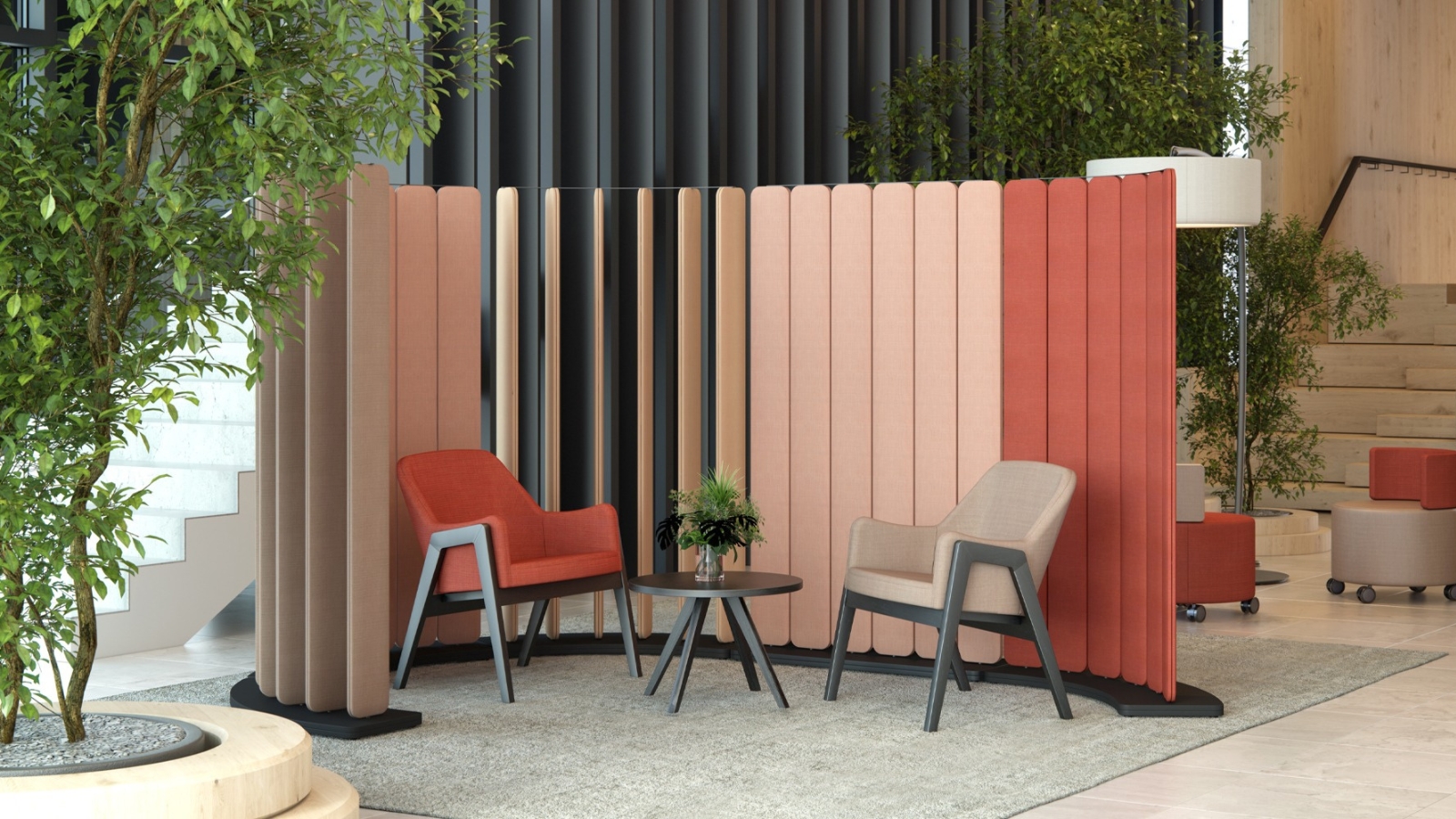 Material: Chipboard core with acoustic foam, upholstered fabric panels, metal legs with optional castors, linkable with I/L/T metal connectors
