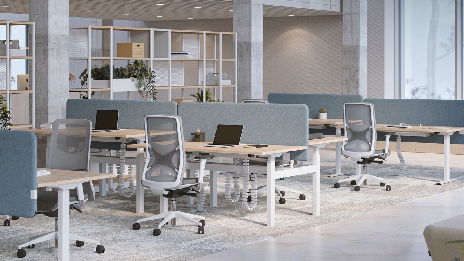 Note: Features a sliding top panel for cable access. The shared intermediate frame allows desks to be positioned side by side while reducing the number of legs required.