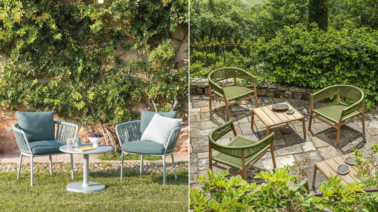 Material: Natural finish teak base frame, aluminium back frame, woven outdoor rope back panel.