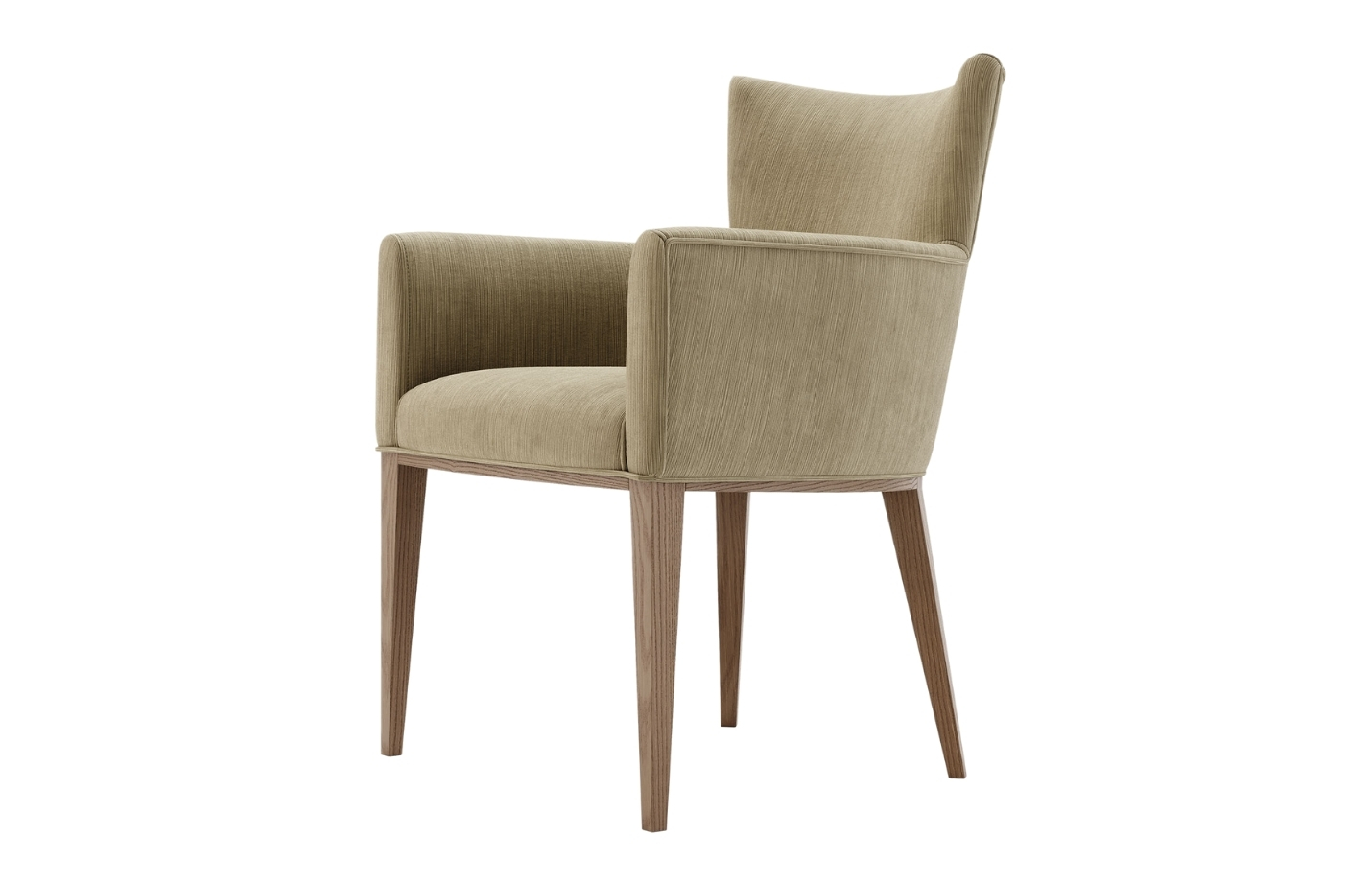 Material: Walnut stained ash, upholstered seat & back in fabric or faux leather with piping.