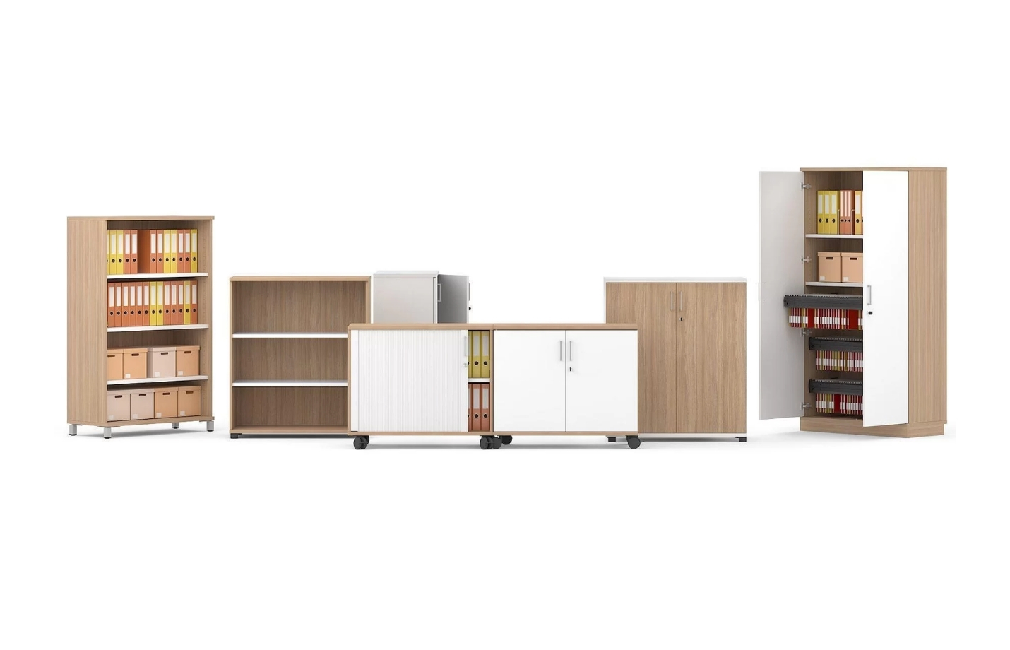 (plinths, legs, castors). Optional add-ons: fabric/whiteboard back panels, counterweights, dividers, and coat rails