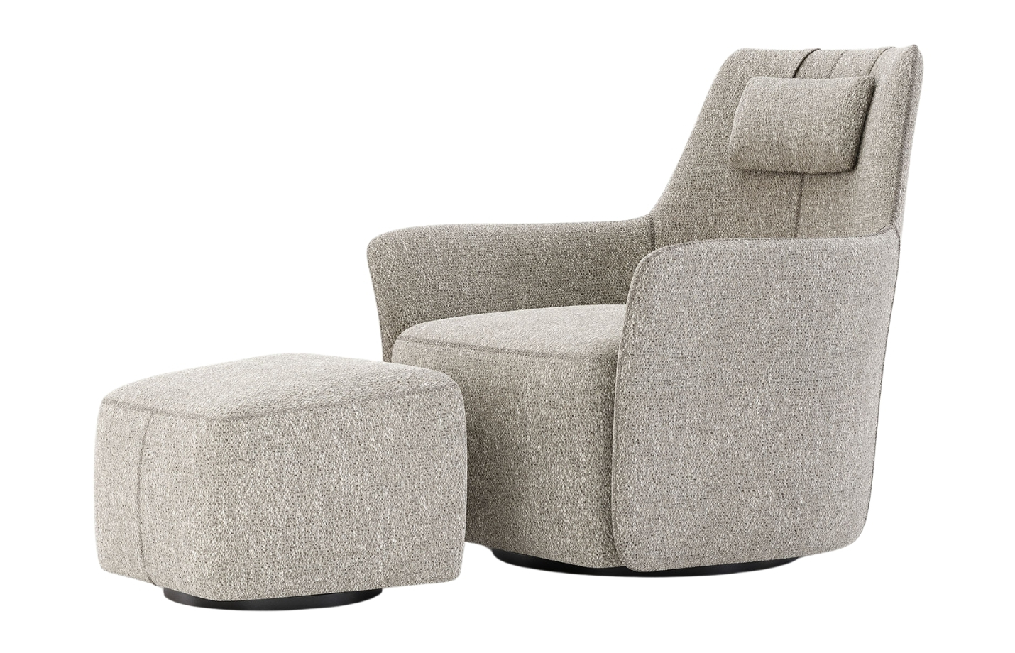 Material: Fully upholstered cushioned shell in fabric or leather; hidden inset swivel base in polished or brushed metal