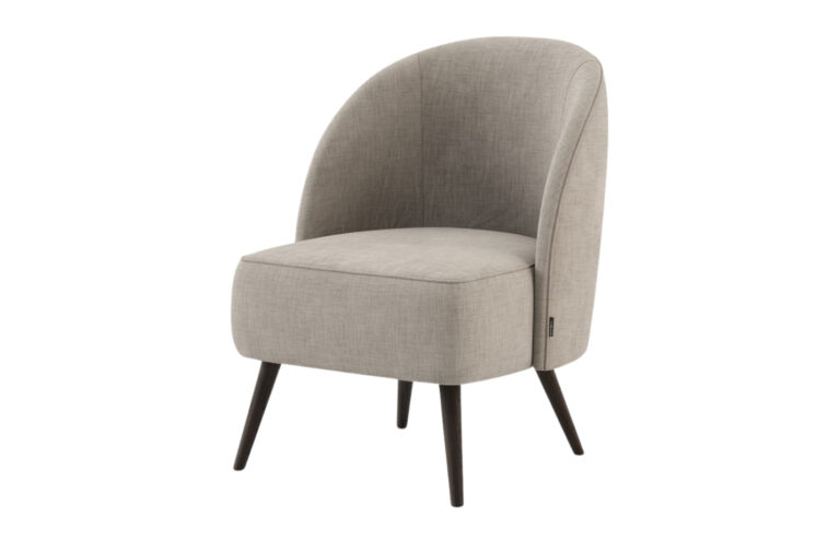 Material: Fully upholstered cushioned shell in fabric or leather; hidden inset swivel base in polished or brushed metal