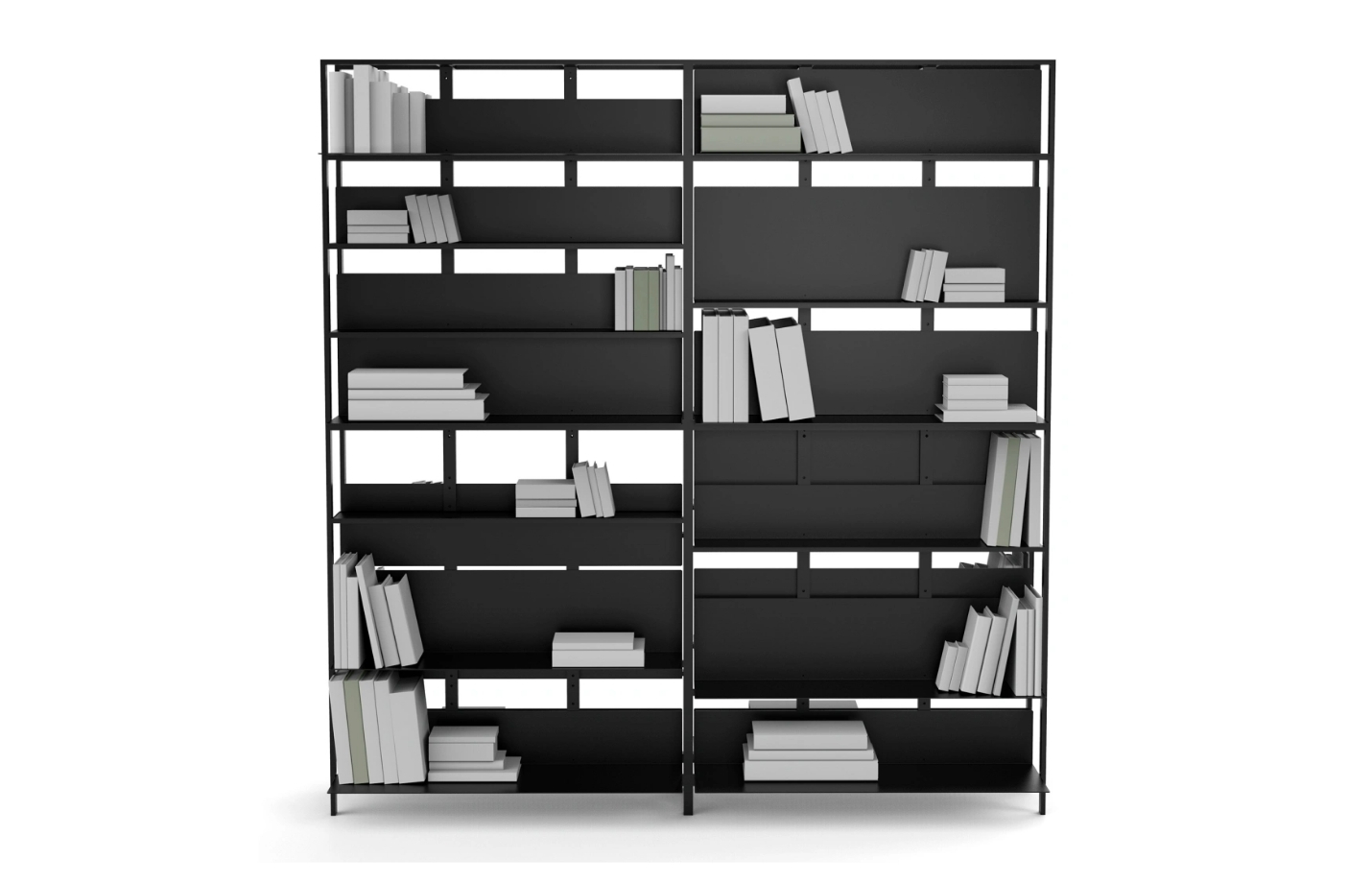 Material: : The system features a powder‑coated aluminum frame with L‑section aluminum shelves available in multiple sizes and orientations, designed for wall-mounted or freestanding modular configurations.