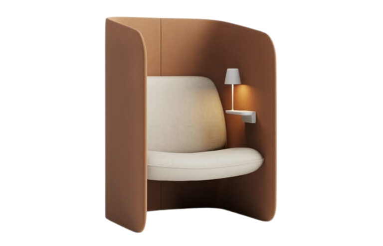 Material: Seat on plywood/chipboard frames with dual-layer high-resilience foam and removable back cushions, fully fabric-upholstered. Acoustic booth walls built from MDF/chipboard coated with shaped and acoustic foam for Class C/D absorption.