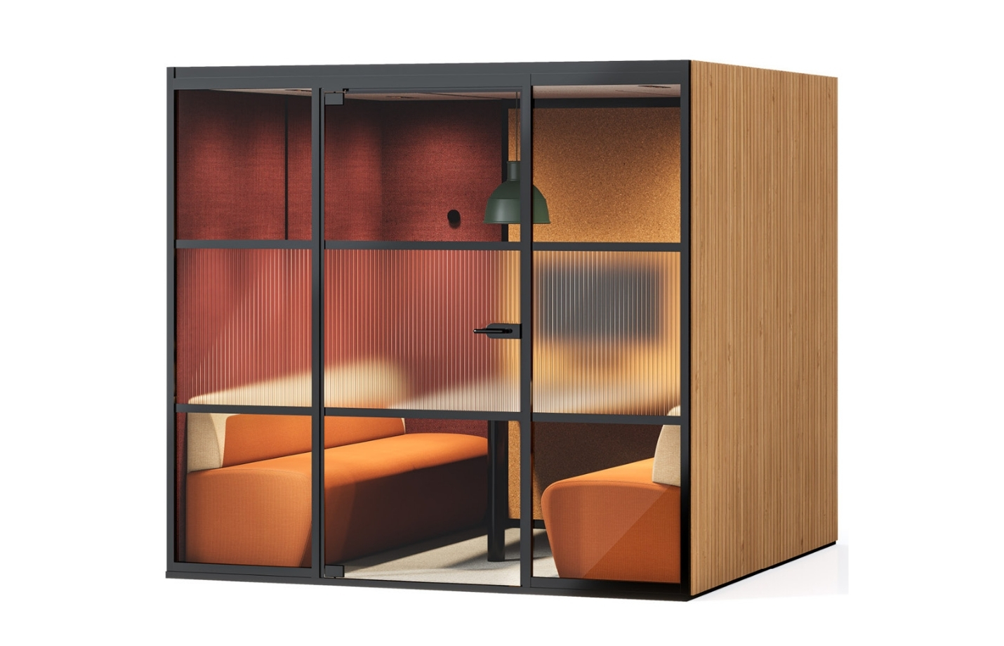 Material: Powder-coated aluminium frame with glazed bars, acoustic walls wrapped in fabric, and toughened/privacy glass panels. Fixed fabric-upholstered CMHR foam seats on plywood/ply supports; includes Fenix tabletop with integrated power/USB, airflow unit, low-glare lighting, cork centre column, and tempered-glass door.