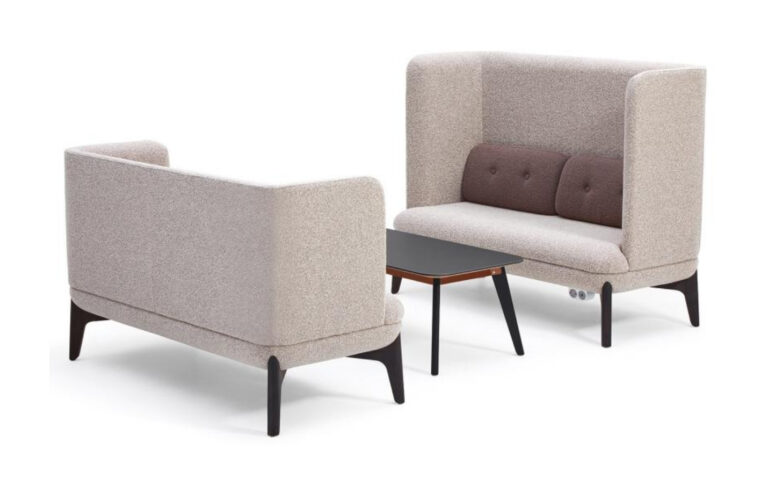 Material: Hardwood and plywood frame with CMHR foam seats, backs & lumbar, webbed seat, upholstered, Wooden legs, plus oak-laminate table and cable-management panel