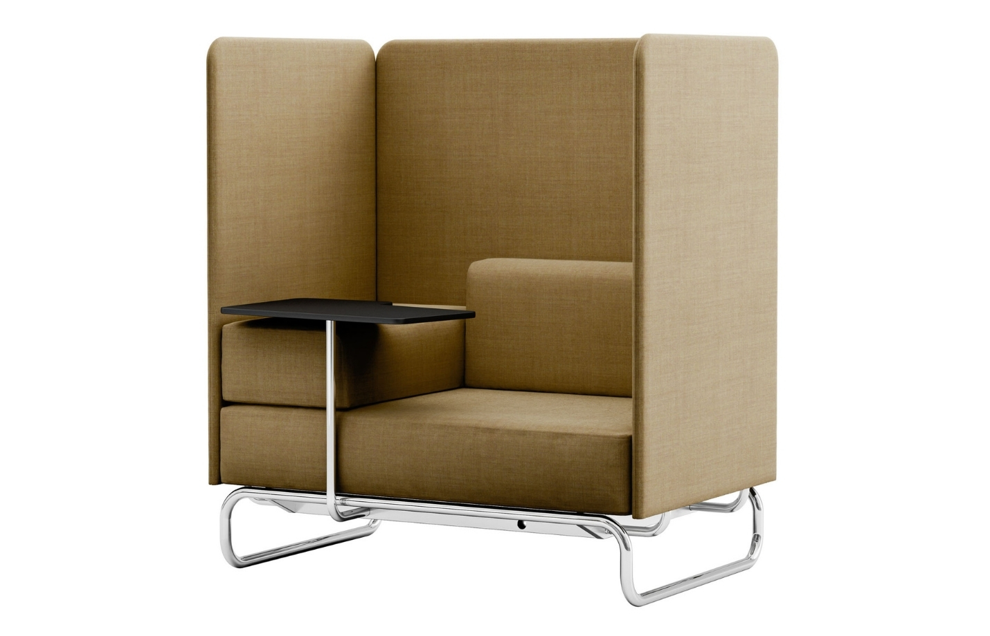 Material: Tubular steel sled frame with removable upholstered cushions on a plywood sub‑frame; available in fabric or leather upholstery