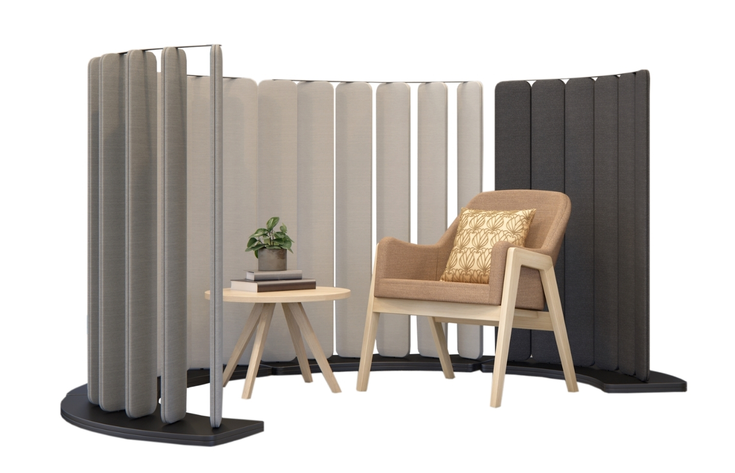 Material: Upholstered fabric panels on MFC base with metal top rail; six 360°-rotating vertical panels