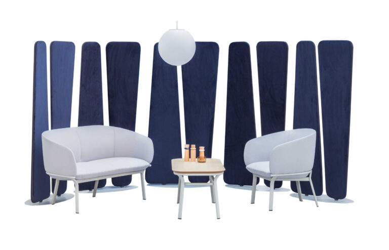 Material: Upholstered fabric panels on MFC base with metal top rail; six 360°-rotating vertical panels